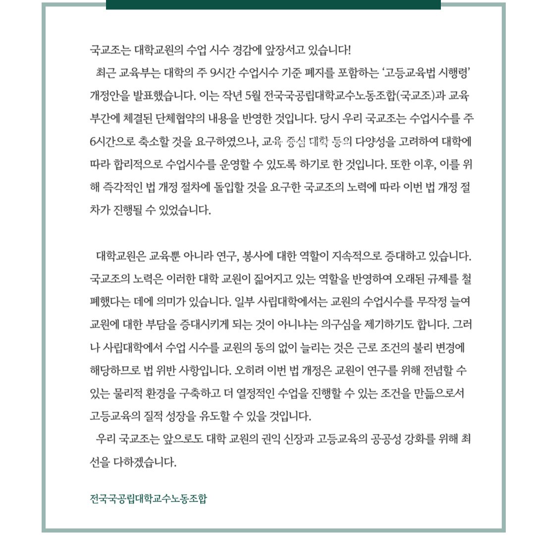 국교조는 대학교원의 수업 시수 경감에 앞장서고 있습니다! 작성자 관리자 내용 첨부파일 제목을 입력해주세요_-001 (4).jpg [ Size : 328.72KB, Down : 259 ] 미리보기 다운로드 태그 조회수 369 작성일 2023년 7월 4일 14시 13분 5초 수정일 2023년 7월 5일 10시 36분 29초 목록보기
