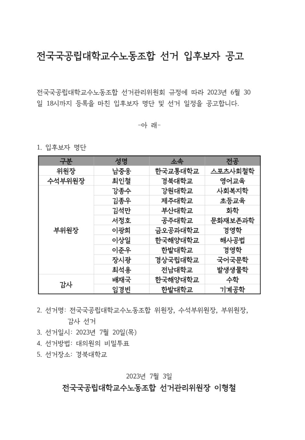 전국국공립대학교수노동조합 선거 입후보자 공고 작성자 관리자 내용 전국국공립대학교수노동조합 선거 입후보자 명단 및 선거 일정을 위와 같이 공고합니다. 첨부파일 전국국공립대학교수노동조합 선거 공고문PDF.jpg [ Size : 203.57KB, Down : 339 ] 미리보기 다운로드 전국국공립대학교수노동조합 선거 입후보자 공고.pdf [ Size : 31.61KB, Down : 534 ] 다운로드 태그 조회수 383 작성일 2023년 7월 3일 12시 25분 34초 수정일 2023년 7월 4일 13시 59분 30초 목록보기