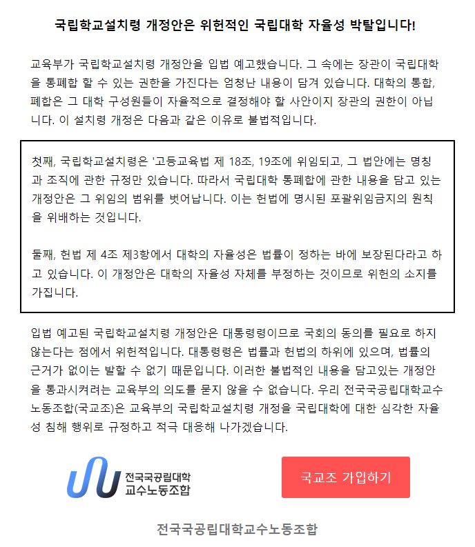 장관이 국립대학을 통폐합한다고요?-2023. 04. 17. 작성자 관리자 내용 첨부파일 11.JPG [ Size : 123.84KB, Down : 389 ] 미리보기 다운로드 태그 #국교조#남중웅 조회수 429 작성일 2023년 4월 24일 17시 40분 54초 수정일 2023년 4월 26일 11시 35분 25초 목록보기
